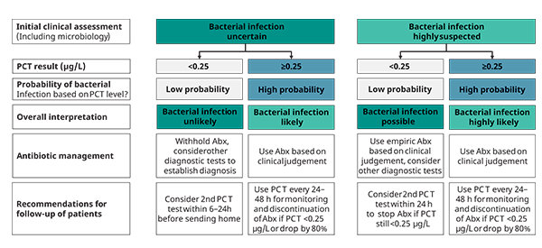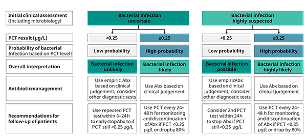 Die Verwendung von PCT ist auch in der Leitlinie der Surviving Sepsis Campaign [9] beschrieben; hier heißt es, dass PCT im Rahmen des Antibiotikamanagements verwendet werden kann. Die PCT-Messung in der Diagnosephase einer Sepsis und vor der Verabreichung von Antibiotika sei ratsam, um einen PCT-Anfangswert zu bestimmen [11].