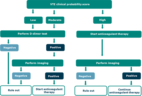Bei Patienten mit geringem (unwahrscheinlichem) oder mittlerem VTE-Risiko wird durch die Bestimmung von D-Dimeren* die Notwendigkeit, bildgebende Verfahren einzusetzen, vermindert [7].
