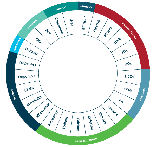 Vue d'ensemble de quelques-uns des paramètres pertinents que vous pouvez mesurer avec la solution d'analyses délocalisées de Radiometer pour les services de soins intensifs et de réanimation. Les paramètres et biomarqueurs de la solution d'analyses délocalisées de Radiometer pour les services de réanimation et de soins intensifs sont inclus dans plusieurs systèmes d'évaluation de la santé tels que APACHE, MODS, SAPS, et LODS [2].