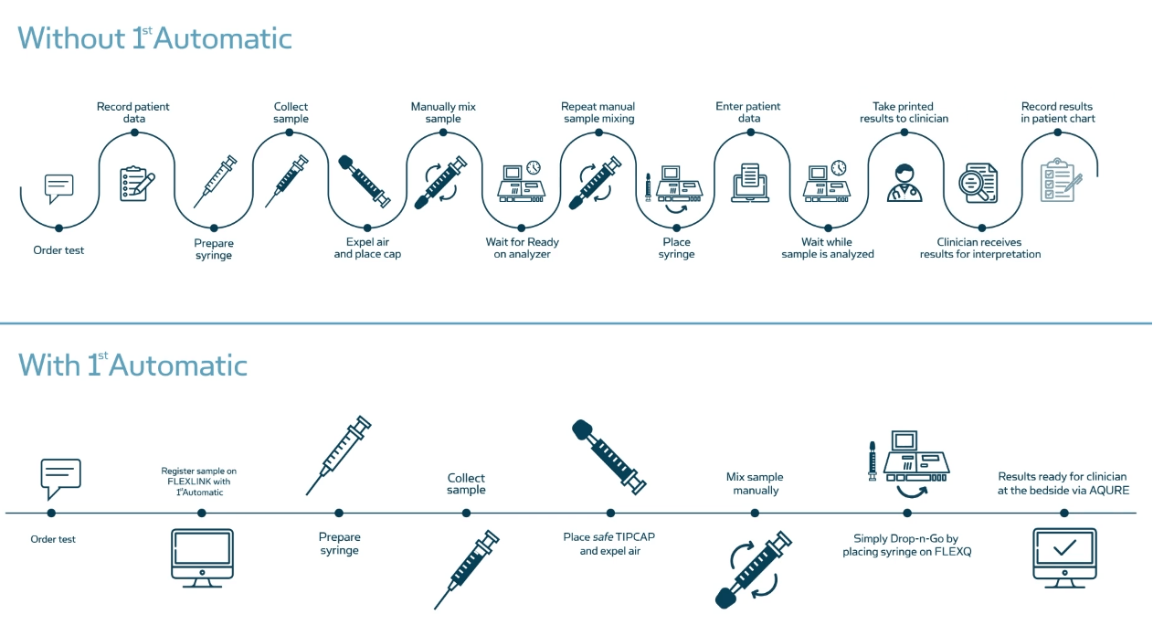 Combinez vos seringues ABL800 FLEX et safePICO avec le système FLEXLINK d’AQURE pour utiliser 1st Automatic. La solution connectée enregistre les ID de patient, d’opérateur et d’échantillon au lit du patient, tandis que FLEXLINK associe ces données. Un exemple d’accélération de votre flux de travail est affiché ci-dessous.